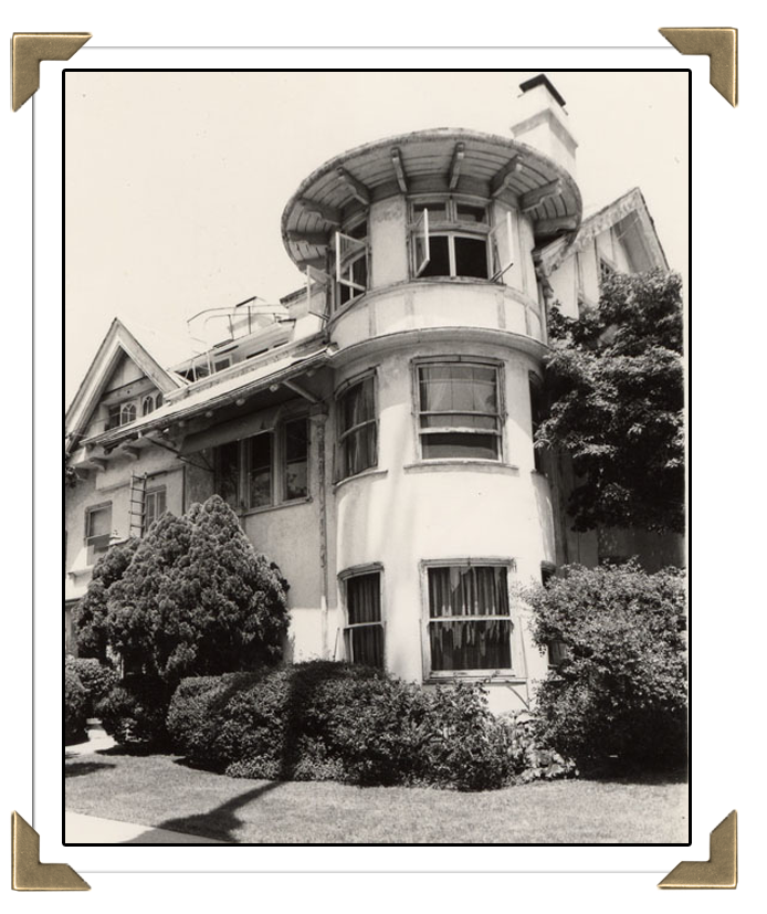 Although defaced by fire escape railings and ladders, the house remains an impressive monument of rare style in Southern California.