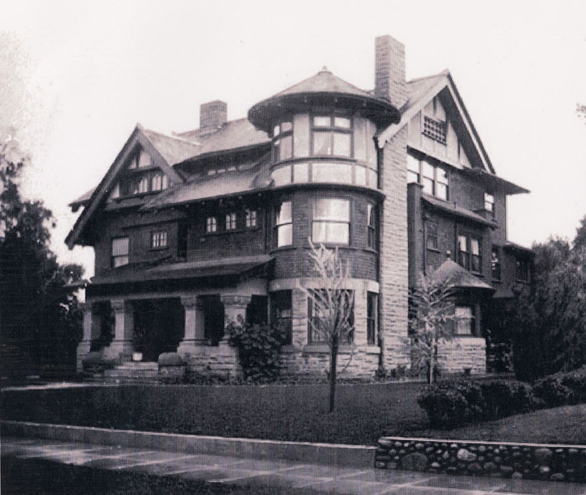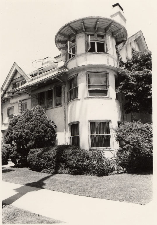 Although defaced by fire escape railings and ladders, the house remains an impressive monument of rare style in Southern California.